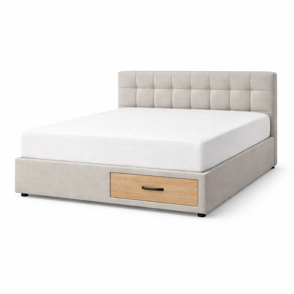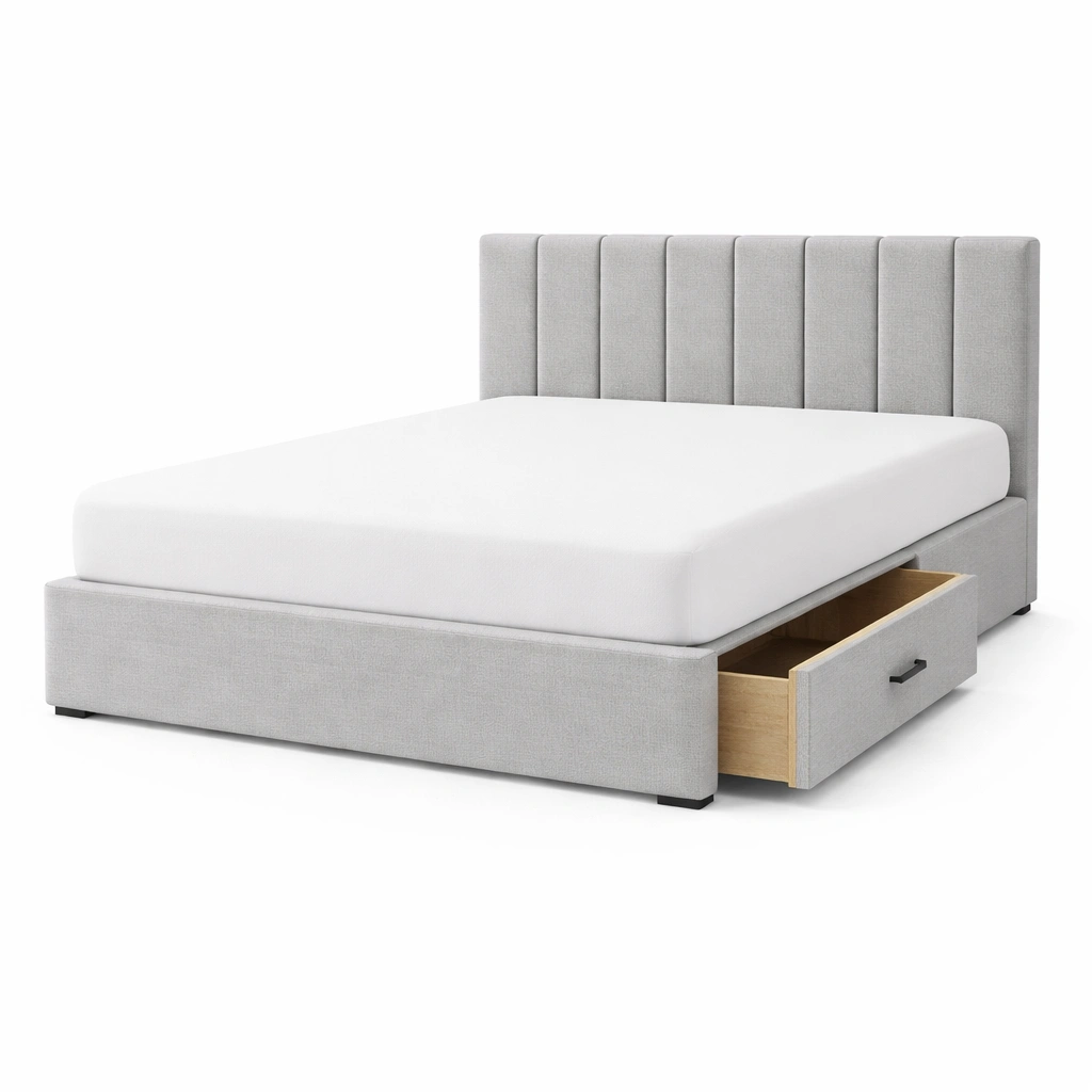 Cama con almacenamiento tapizada en tela gris con cajón