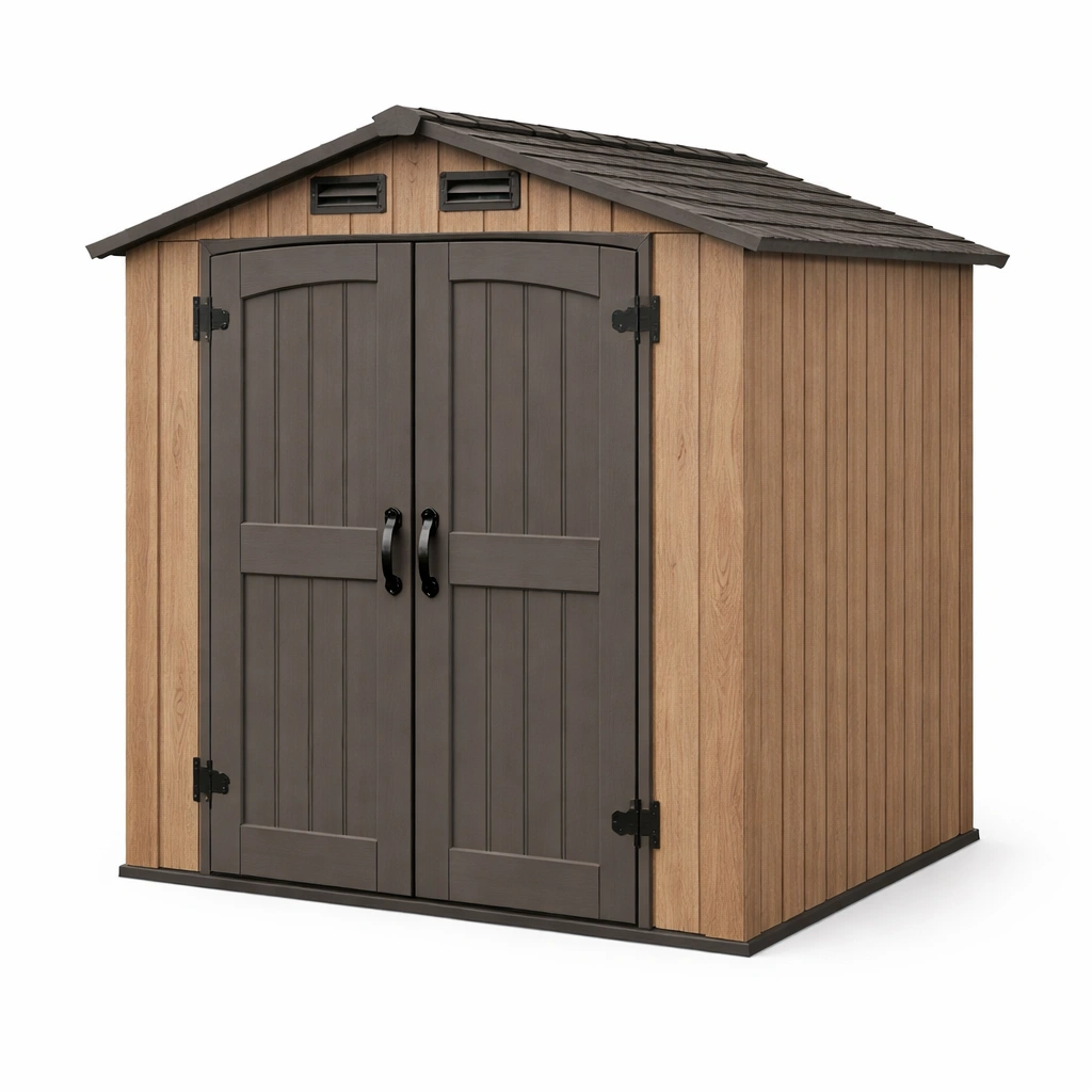 Doble puerta abatible y ventilación integrada en el techo. Resistente al agua y UV. Incluye cerrojo de seguridad.